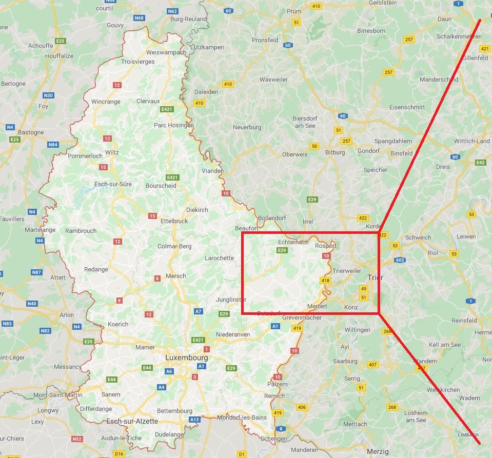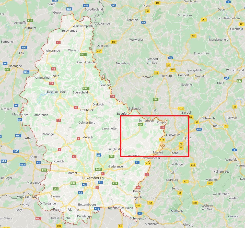 The map on the left below is the country of Luxembourg. The map on the right is the zoomed-in area where the Knewel family originated in Luxembourg. (Click on image for larger view.)