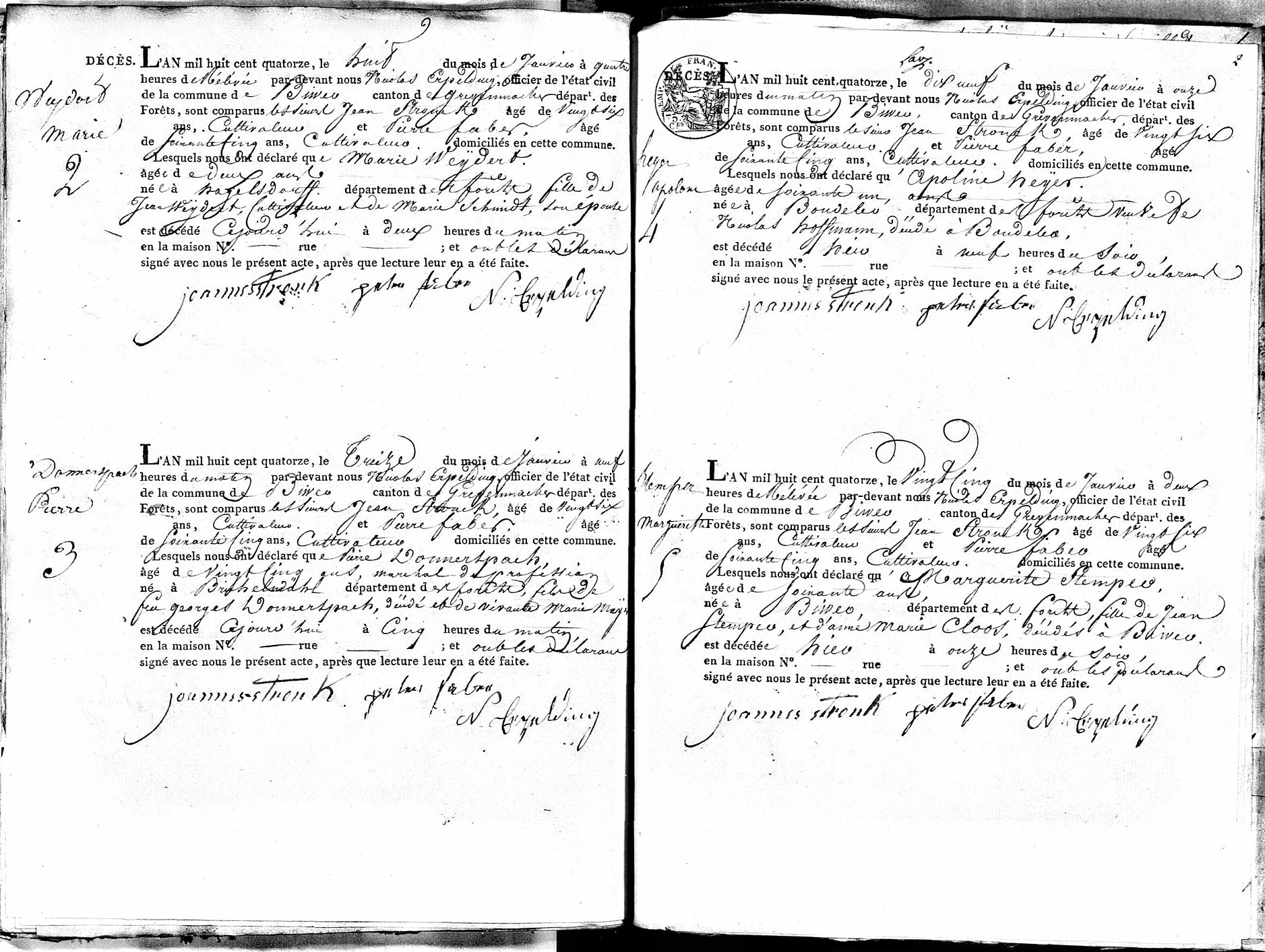 After Appollonia's death, Nicolaus then married Katharina Hoffmann on 18 Dec 1822 in Boudler. Nicolaus and Katharina had one child, a son, Nicolaus, born 20 Nov 1823 in Boudler.
