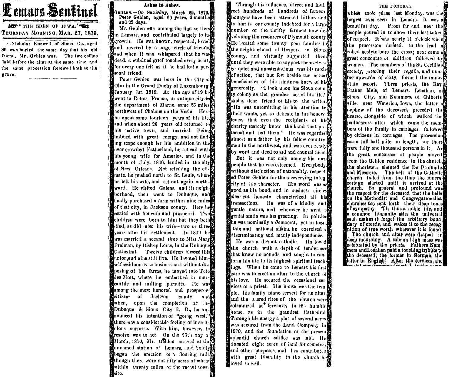 Nicolaus died 22 Mar 1879, and was buried 24 Mar 1879 in Le Mars. His funeral Mass was share with Peter Gehlen, a well known Luxembourger in Iowa history.